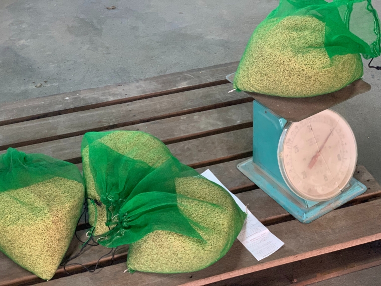 今回、西尾産「山田錦」をつくる為に稲種子を20㎏使用します。これを5㎏づつ4つに分けます。小分けにすることにより温度管理がしやすく、後工程にある冷却にも効果があります。また計量は種籾の吸水率を確認するときの為に正確に行います。