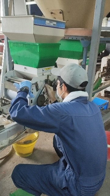 種まきの工程でお米を一定の量で苗箱にまくためには、最初に種まき機の調整が必要になります。