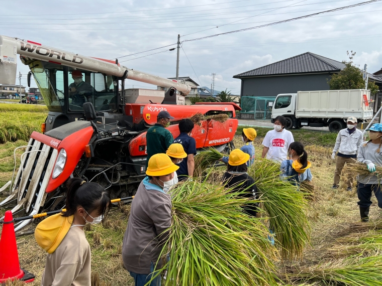 刈って束ねた稲を生徒にコンバインまで運んでもらい、実際の脱穀を見学してもらいました。