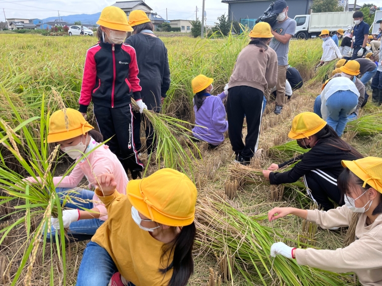 2022年9月29日に西尾市立横須賀小学校の5年生と山田錦の稲刈りを行いました。
