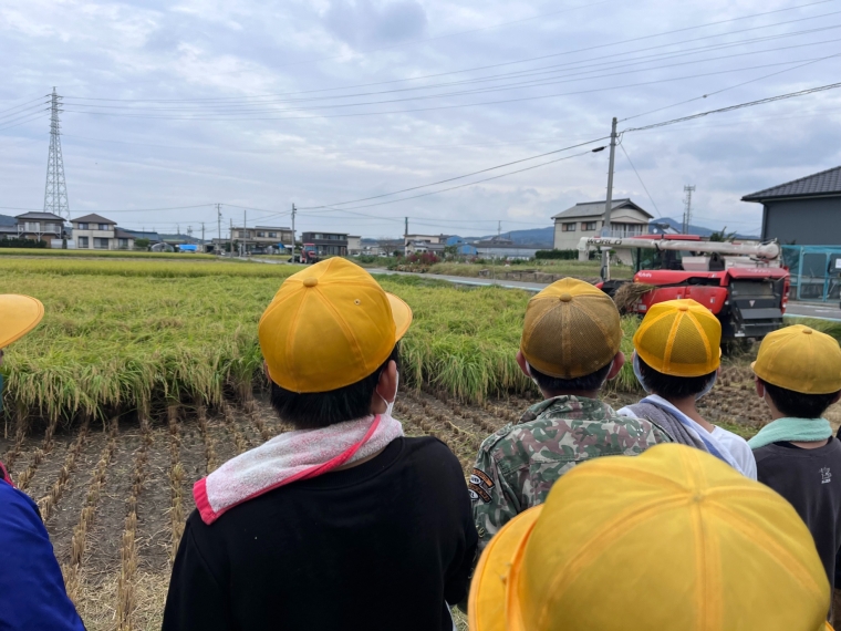 咲こう農場の尾崎さんに説明をしてもらいながら刈られていく様子を見て「はやい!」「かっこいい!」と目がキラキラしていました。