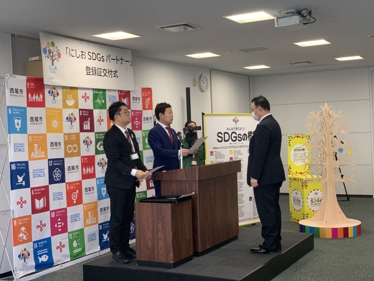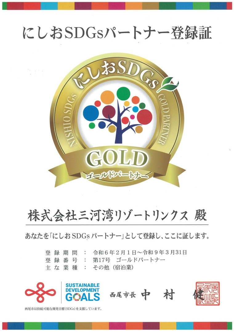2024年02月01日(木) 「にしおSDGsパートナー」登録証交付式 この度、三河湾リゾートリンクスは西尾市がすすめる「にしおSDGsパートナー登録制度」にゴールドパートナーとして登録をいたしました。この制度を通じて、企業・団体と連携して地域活性化を促進し、SDGsの実現を推進してまいります。 「にしおSDGsパートナー」登録交付式 2024年2月1日(木) 西尾市役所 西尾市役所にて にしおSDGsパートナーの皆さん 最新情報 Q X イベント告知 商品情報 SDGs